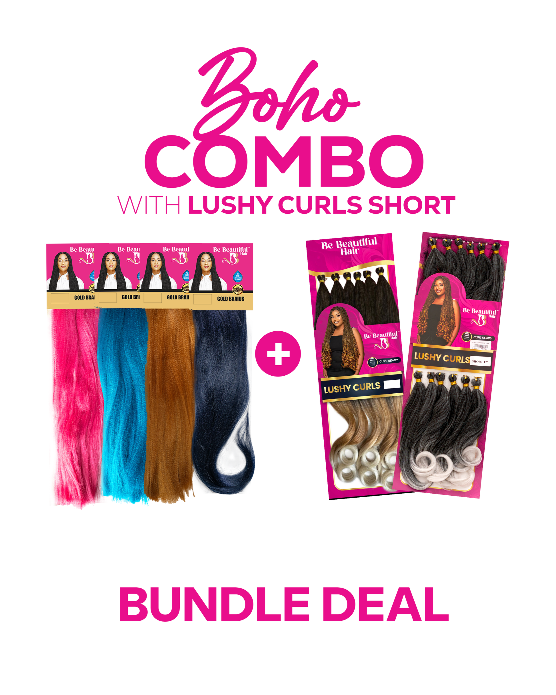 Achieve the perfect Boho braid look with our premium Gold Braids + Lushy Curls Short Combo. Designed for elegance, versatility, and long-lasting beauty, this luxurious combination gives you soft, flowing curls blended with sleek, lightweight braids for a flawless natural finish.